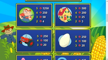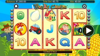 The reels are placed against the cornfield background and together with the Chicken Scatter symbol, Funky Chicken features The Scarecrow as the Wild, Angry Farmer icon, Farm House and the Tractor as the most profitable symbols and A, K, Q, J, 10 and 9 and lower value icons.