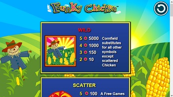 Bets in Funky Chicken start at $0.01, as the player can opt to wager on a single line. The maximum coin value is $2.50, making the slot stake limit $62.5/$2.5 per line. Combination of 5 highest value symbol can produce a payment of 5,000 coins, or $12,500.