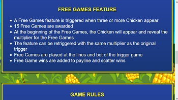 At the start of the Free Games mode, the Chicken icon will pop up again, revealing the bonus games multiplier. Any cash awards that are generated during this mode will be added to bet lines and Scatter icon winnings.