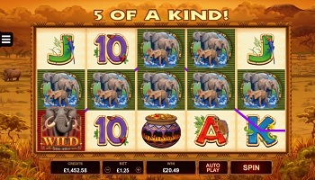 Once you find yourself on the African soil, you will meet King Tusk and his family representing high-value symbols along with pots with painted elephants and African ornaments on them. These pots are full of golden coins, so look out for them for some big wins. Playing card icons award low-value payouts. Visually, the slot machine is a typical Microgaming affair with decent graphics and smooth animations.