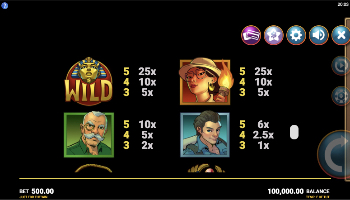 Getting to the symbols which will make appearances on the reels, the Wild Pharaoh is one of them, after which we see images of the three archaeologists (young woman, old man, young man), and of jewelry representing the Eye of Ra, Horus, the Ankh and a canopic jar.